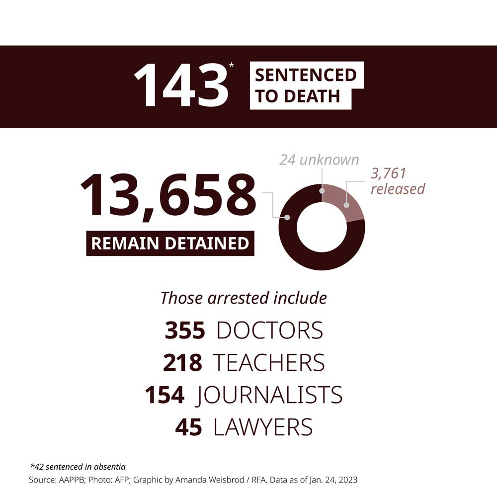 According to the Assistance Association for Political Prisoners (Burma), 17,481 political prisoners have been arrested since the coup – with 13,680 still detained. Among the prisoners are leaders of the deposed National League for Democracy, which won landslide elections in 1990, 2015 and 2020.